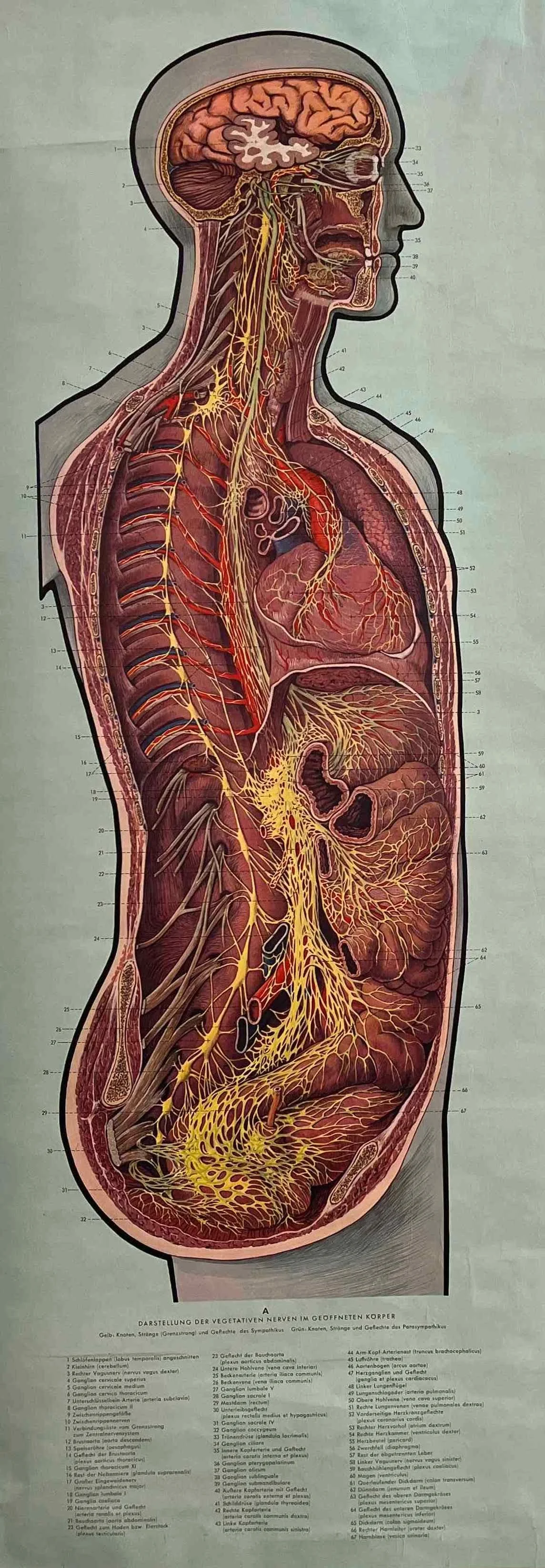 Eventually this led me to a reprint of an Atlas of Anatomy and Surgery published between 1831 and 1854, originally in French, by J.M. Bourgery & N.H. Jacob, which has been called, “The most beautiful anatomical treatise in history,” and was republished by the German art publisher Taschen. We can imagine that surgeons in training need accurate maps in order to not accidentally sever nerves. The illustrations that I discovered therein accorded with my own interoceptive experience, and completely altered my understanding of the anatomy of these systems.