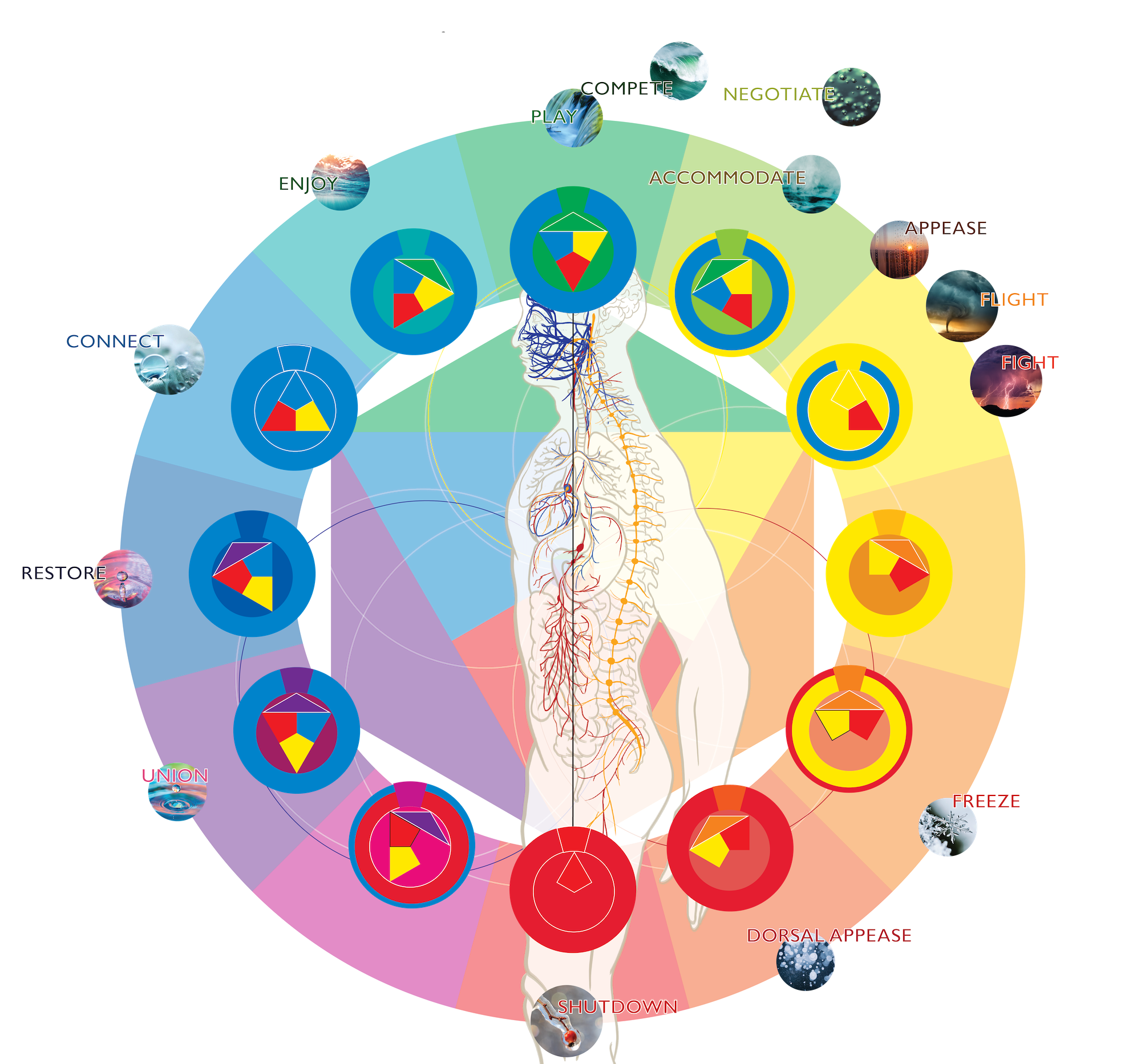 Can you see the largest circles above, in primary colors? Can you see that they are blue, yellow, and red? All of the blue circles have a foundation in the pulse of safety. Once the circles become yellow, a set of neural systems turn off, and a set of chemical systems turn on. This happens again when the outer circle changes color from yellow to red. Each of these transitions changes the way that your Autonomic systems are organized, and the chemistry that is released.